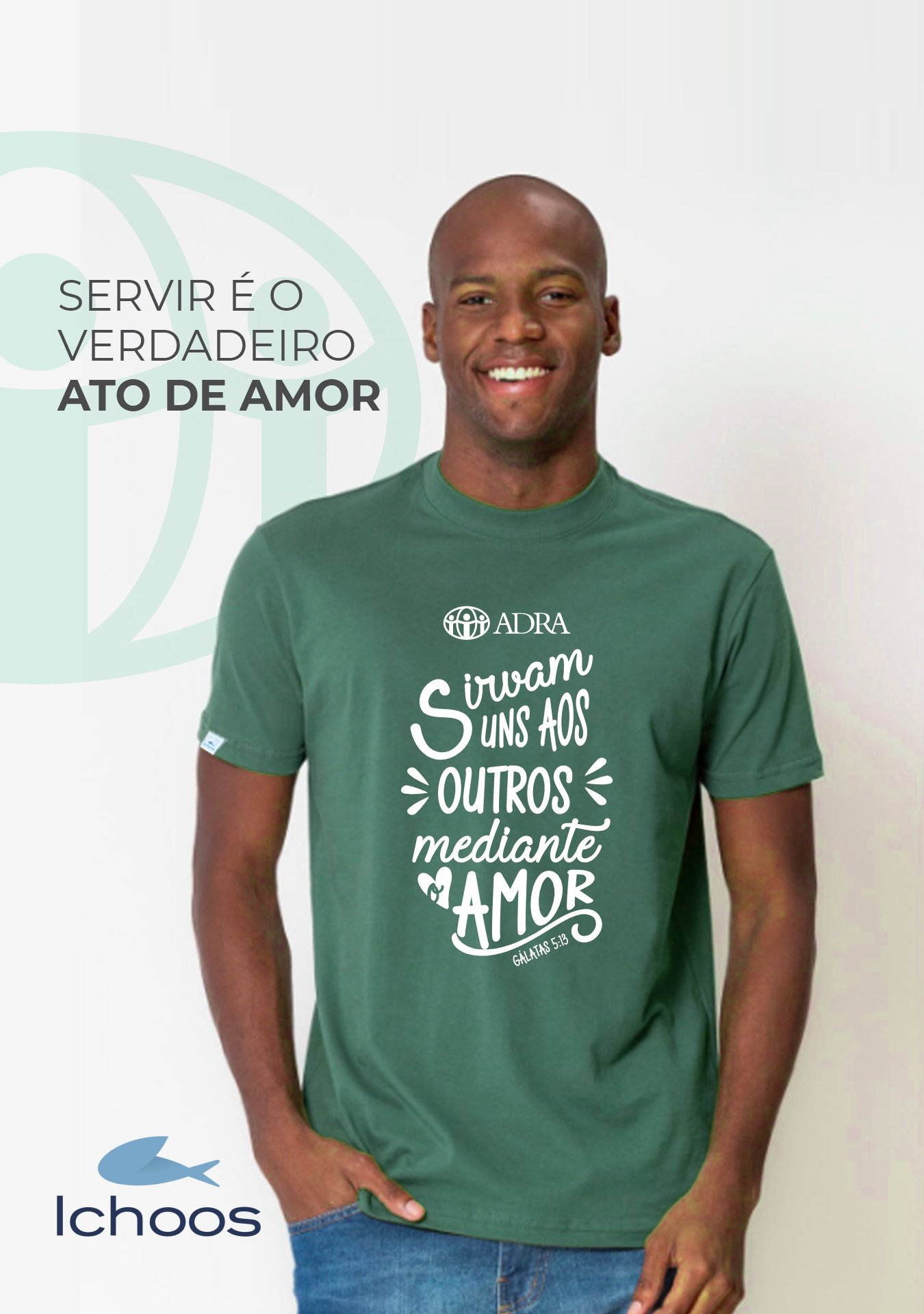 A camiseta ADRA é confeccionada em malha 100% algodão, na cor verde, com estampa em poliamida de alta durabilidade. Inspirada em Gálatas 5:13, traz a frase: “Sirvam uns aos outros mediante o amor” — um convite para viver o propósito do serviço cristão em cada ação.